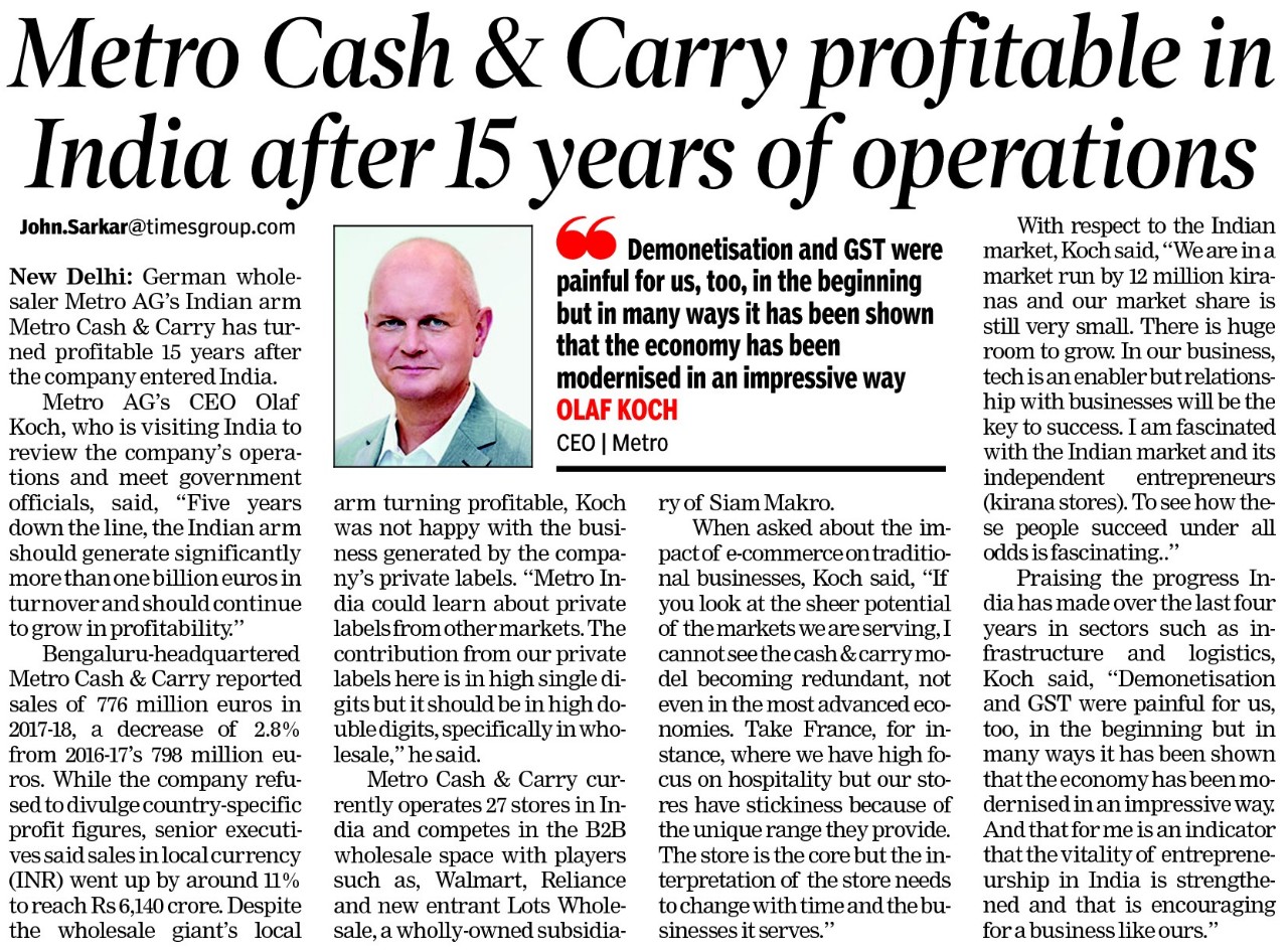 METRO CASH & CARRY PROFITABLE IN INDIA AFTER 15 YEARS OF OPERATIONS